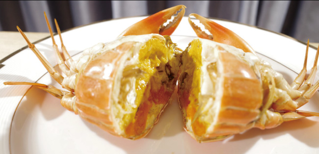 每逢炎夏,青母蟹會(huì)在產(chǎn)卵時(shí)棲身于淺灘河畔,在陽(yáng)光的照射下,體內(nèi)的蟹膏分解成金黃色的油脂,然后滲透到體內(nèi)的各個(gè)部分,使得整只蟹晶瑩剔透、充滿黃油,因此被稱為黃油蟹。